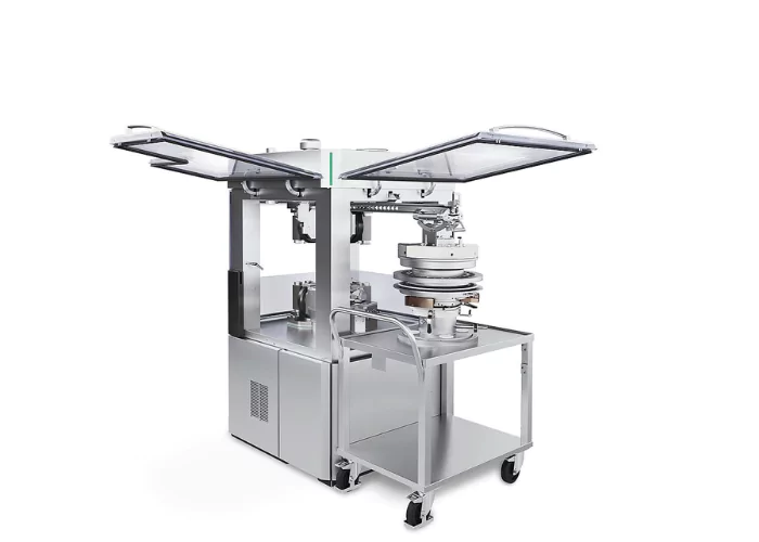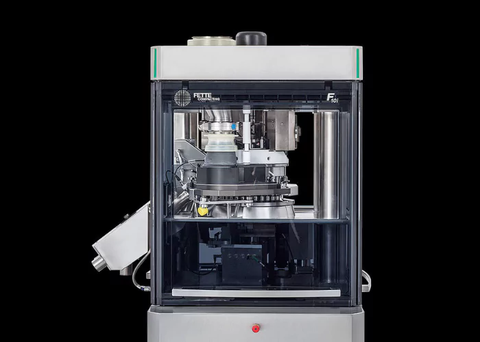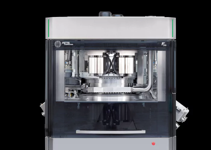 After the operator has moved the compression stations into the parking position, he can change the turret with the aid of a mechanism integrated into the machine. The innovative turret changeover principle, together with Fette Compacting’s TRI.EASY design, ensures minimal handling effort and uniquely simple operation.